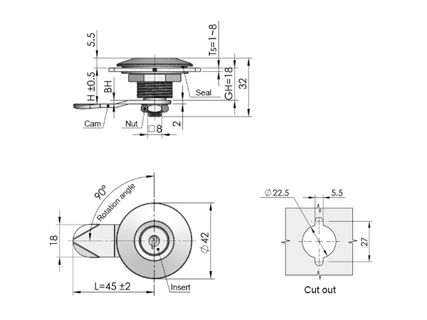 | MS804 | MS804Z3A050008 | Carcaça e inserção ZDC cromado brilhante, came de aço zincado branco | Abertura ou fechamento em giro de 90 graus | S1B45Y02001 (Ts=2mm) |