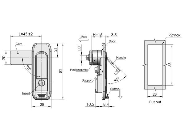 A fechadura para armário com puxador flexível MS738 adota botão, puxador e carcaça ZDC nanômetro de pintura, inserção ZDC, came e suporte de aço revestido de branco. Montado com diferentes cames, o produto é capaz de alcançar fecho de um ou três pontos. É também fácil de ser montado e aberto.